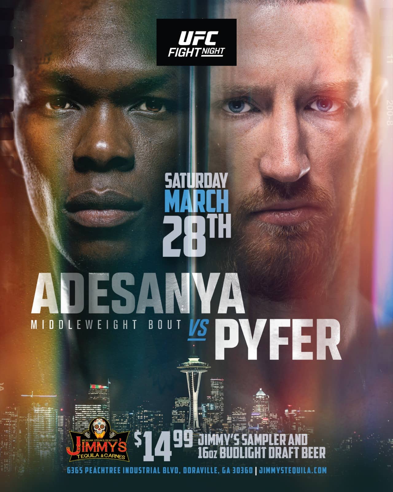 🥊 UFC Fight Night at Jimmy’s Tequila! The octagon heats up on Saturday, March 28th as Adesanya vs. Pyfer battle it out in an explosive middleweight matchup! Catch every strike, takedown, and knockout on our big screens while enjoying our $14.99 Jimmy’s Sampler with a 16oz Bud Light Draft special.