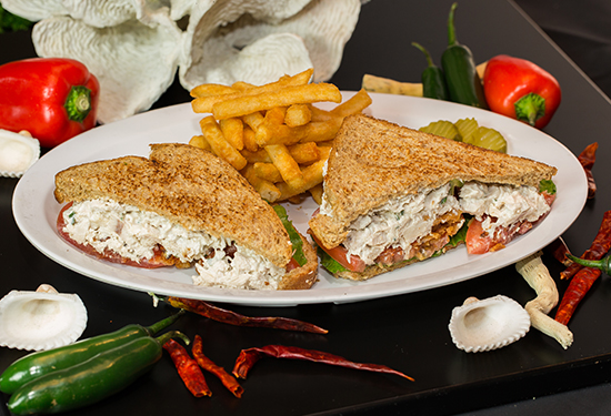Salmon sandwich with crispy bacon, lettuce, tomato and our special house sauce on white bread.